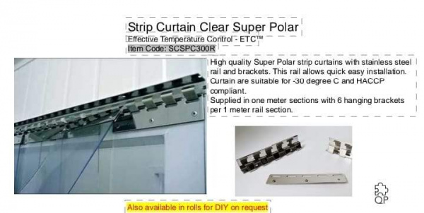 High quality Super Polar strip curtains with stainless steel rail and brackets. This rail allows quick easy installation. Curtain are suitable for -30 degree C and HACCP compliant.